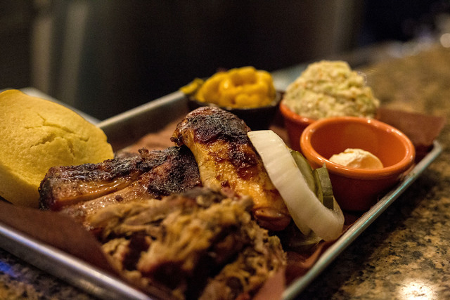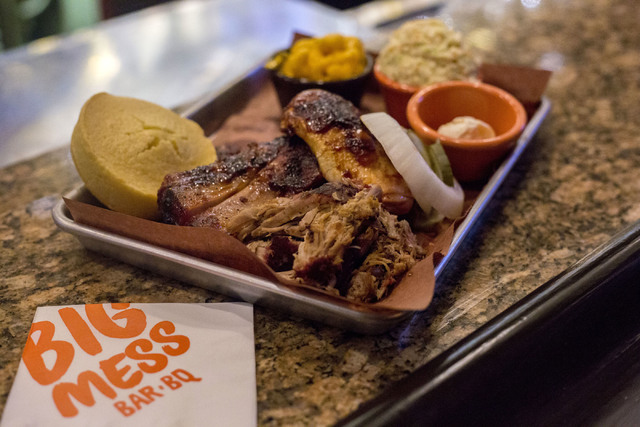 Dry-rubbed and smoked in-house, the brisket is served with barbecue baked beans and slaw, $15.99, and also available as a platter.