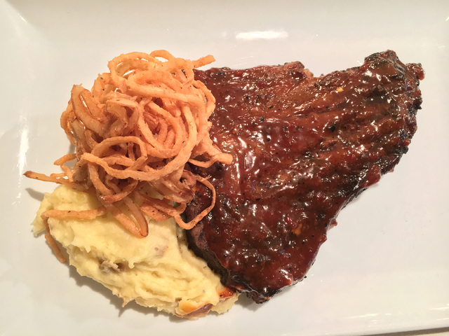 This big steak with barbecue flavor, cooked over a 600-degree grill, is topped with crispy onions and served with mashed potatoes, $55.