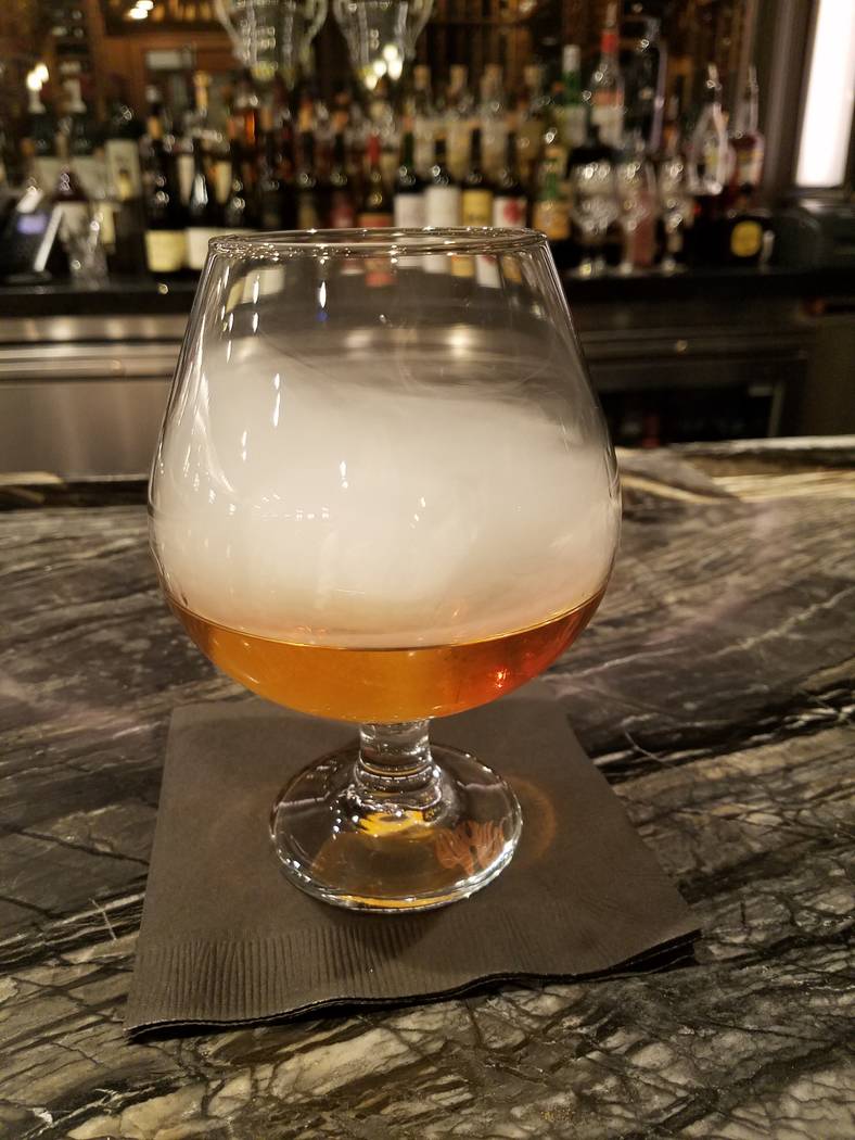 Hennessy, Bulleit Rye, Pernot Absinthe, maple syrup and Peychaud’s Bitters are shaken with ice and finished with applewood smoke, which is captured in another glass and brought to the table for the guest to release. It’s $22.50.