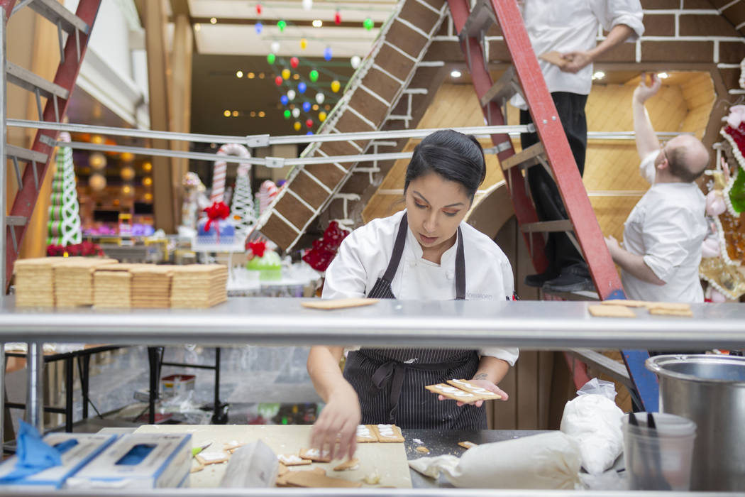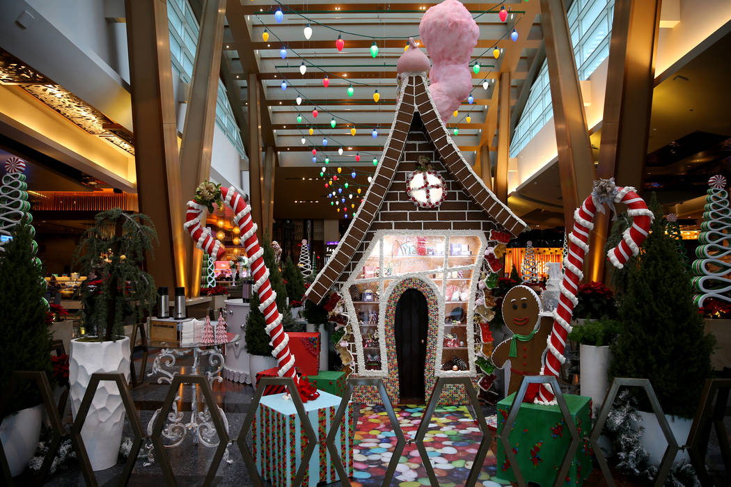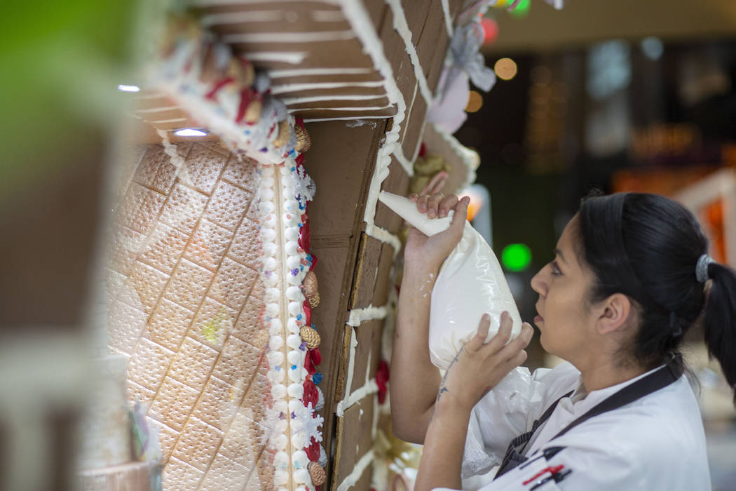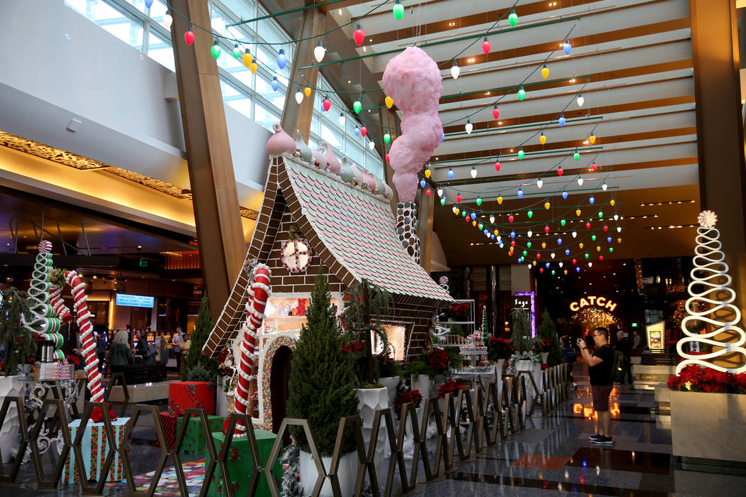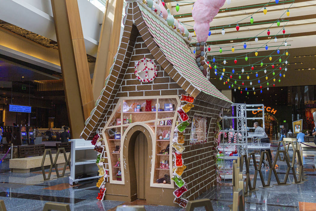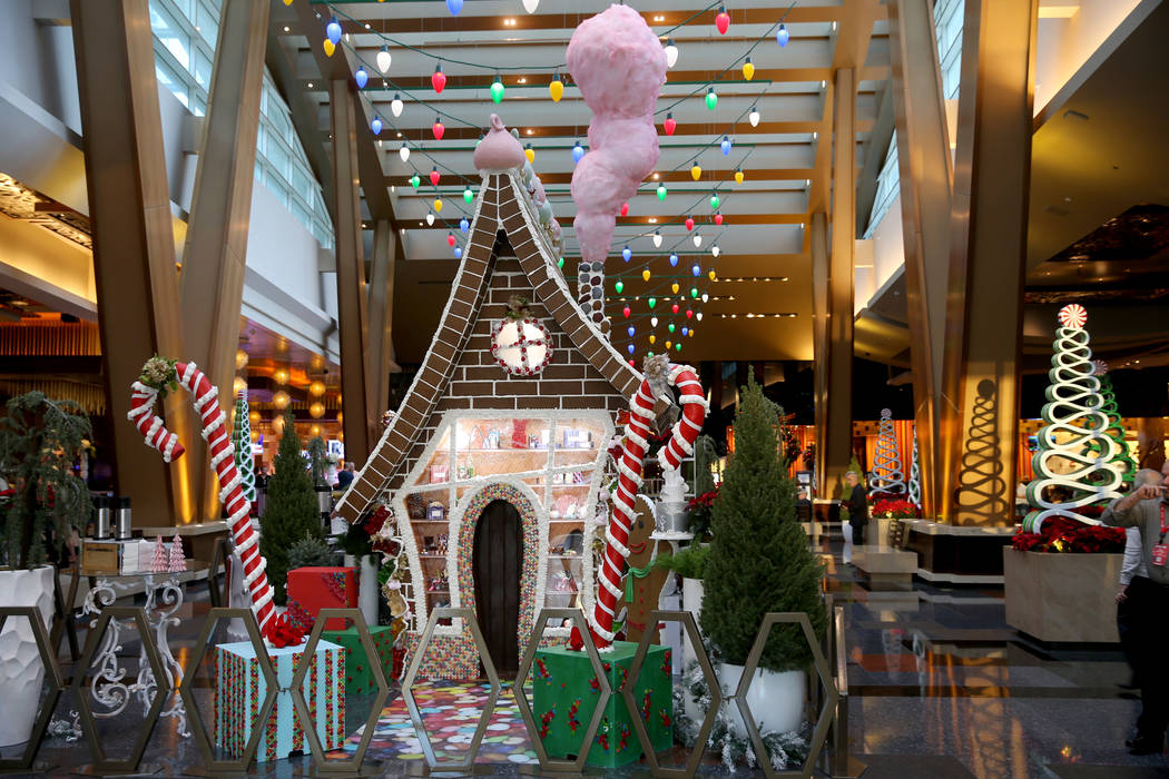 The team at the Patisserie at Aria has been working as hard as elves for two weeks to construct the whimsical structure, bake over 600 pounds of gingerbread, bring 5-foot-tall gingerbread people to life and create molds for 30 giant sugar bears.