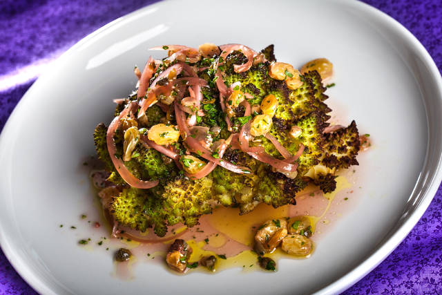 At Standard & Pour in Henderson, Courtney serves whole smoked romanesco with capers, red onions, golden raisins and herbs.