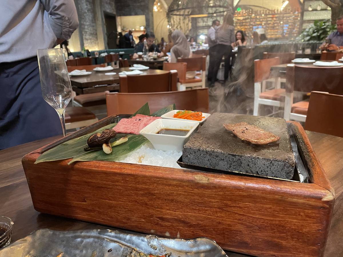 The tender A5 Japanese Miyazaki Wagyu is served with yuzu soy, garlic oil, sea salt and sesame and a hot stone on which guests can cook each delicate cut to the desired temperature.