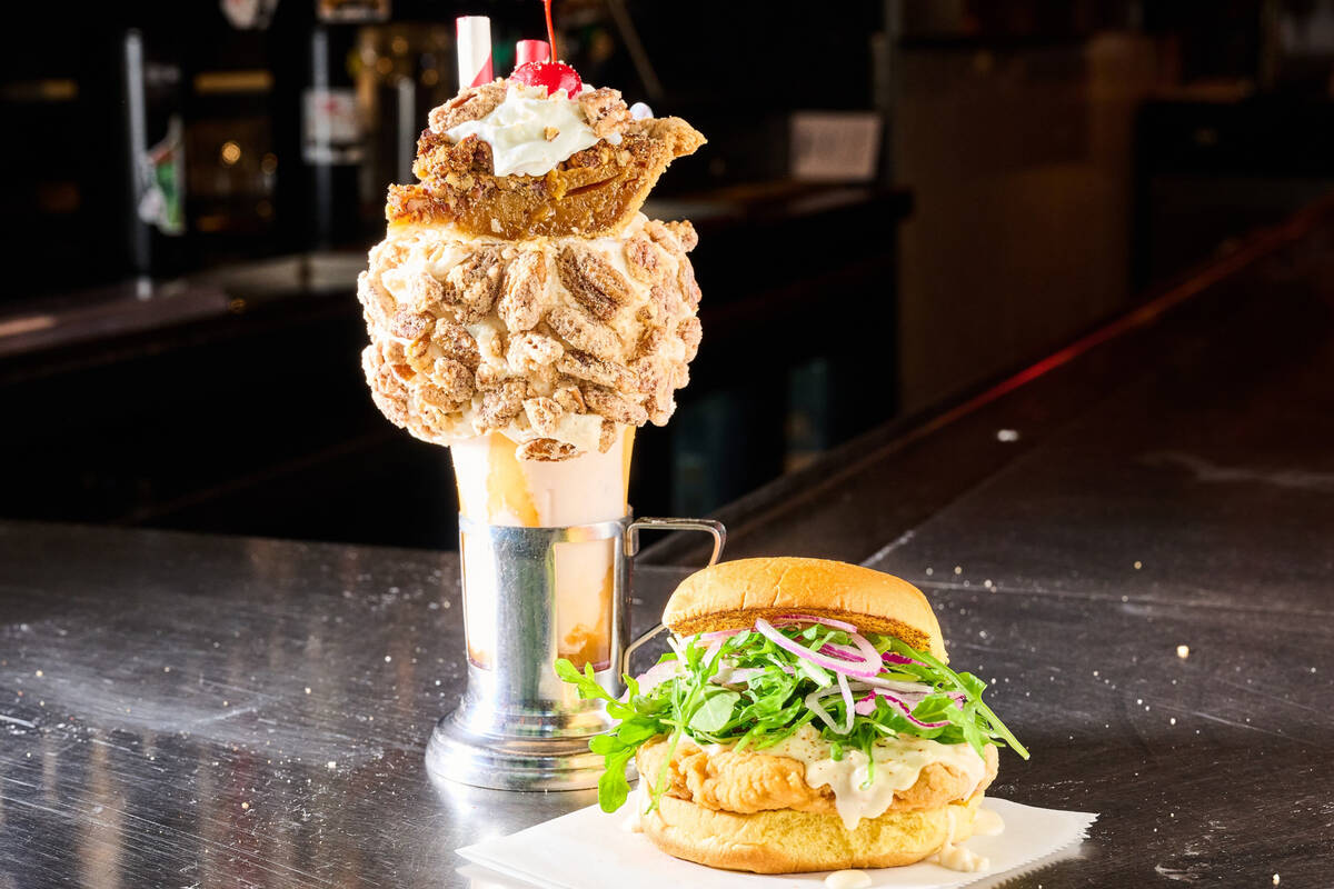■ Cheerful excess is always in season at Black Tap Craft Burgers & Beer in The Venetian. Through November, look for a Pecan Pie CrazyShake ($20) that assembles a vanilla-frosted rim, glazed pecans, a slice of pecan pie, whipped cream, caramel drizzle and a cherry. A brawny Chicken Fried Turkey Sandwich ($21) layers spicy chicken fried turkey, country gravy, watercress, shaved red onions and cilantro, with loaded mashed potato tots on the side.