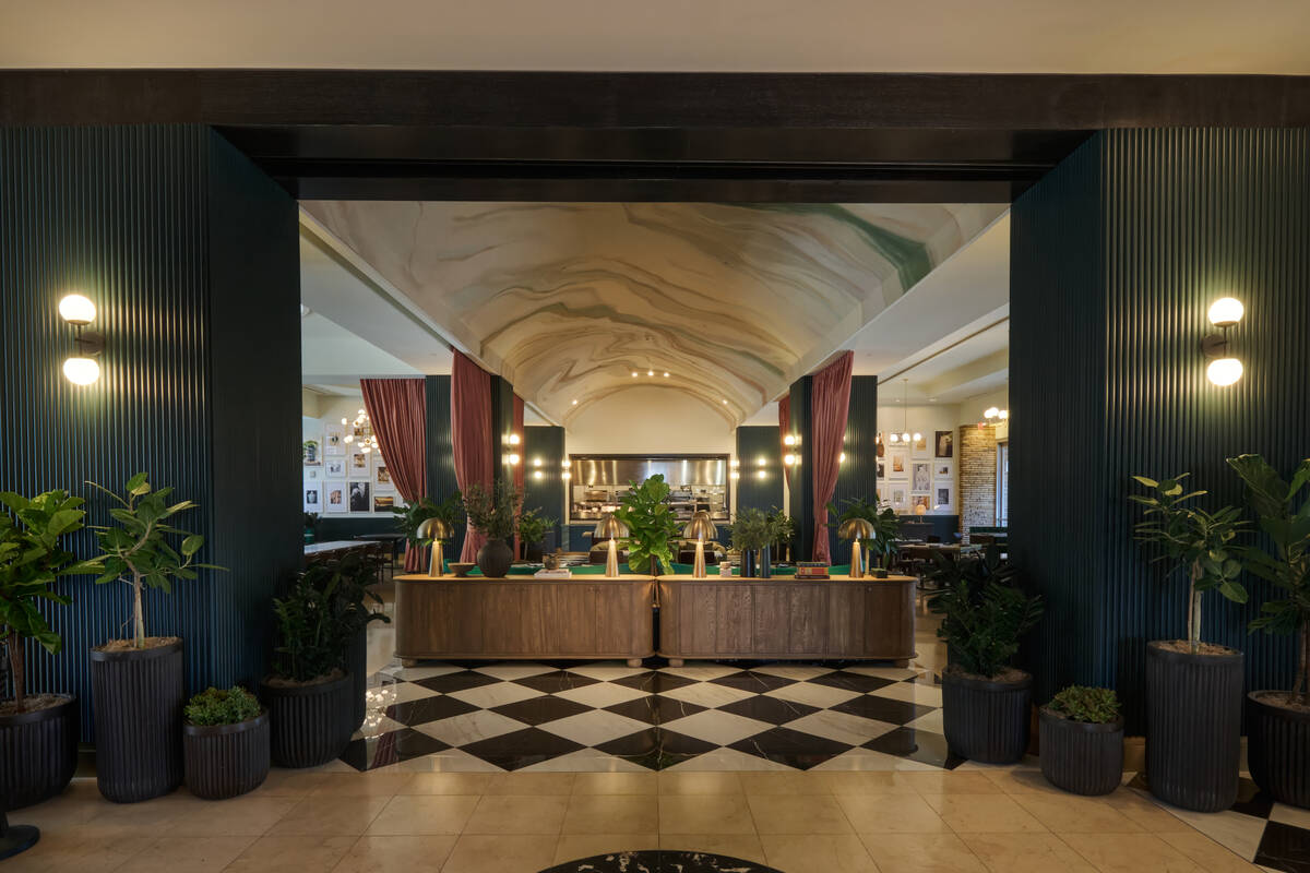 A barrel vaulted ceiling, painted with faux marbre technique, runs along one side of the restaurant. Near the open kitchen, a wall holds a cluster of images of Italy: a watercolor Venetian palazzo, a vintage photograph of the Colosseum, wedges of cheese set out for sale in a market, an old yellow Fiat parked in front of a church.