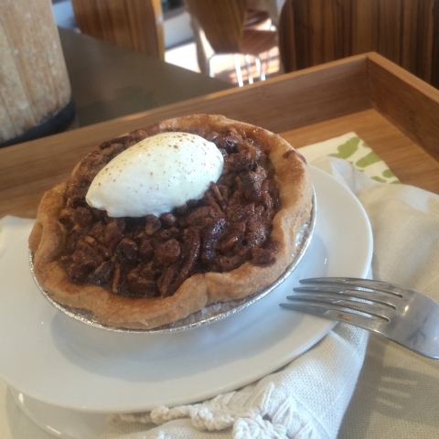 A flaky pie crust is filled with pecans, orange zest, bourbon, cinnamon and nutmeg (chocolate chips optional!), $5.25 for a 4-inch pie, $28 for an 11-inch pie.
