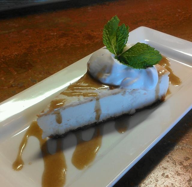 A nondairy New York-style cheesecake in a graham-cracker crust is served with coconut cream and bourbon caramel sauce, $6.
