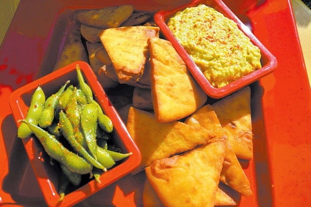 The hotel’s new rooftop poolside restaurant serves the soy beans with garlic-soy glaze and an edamame dip with pita chips, $6.