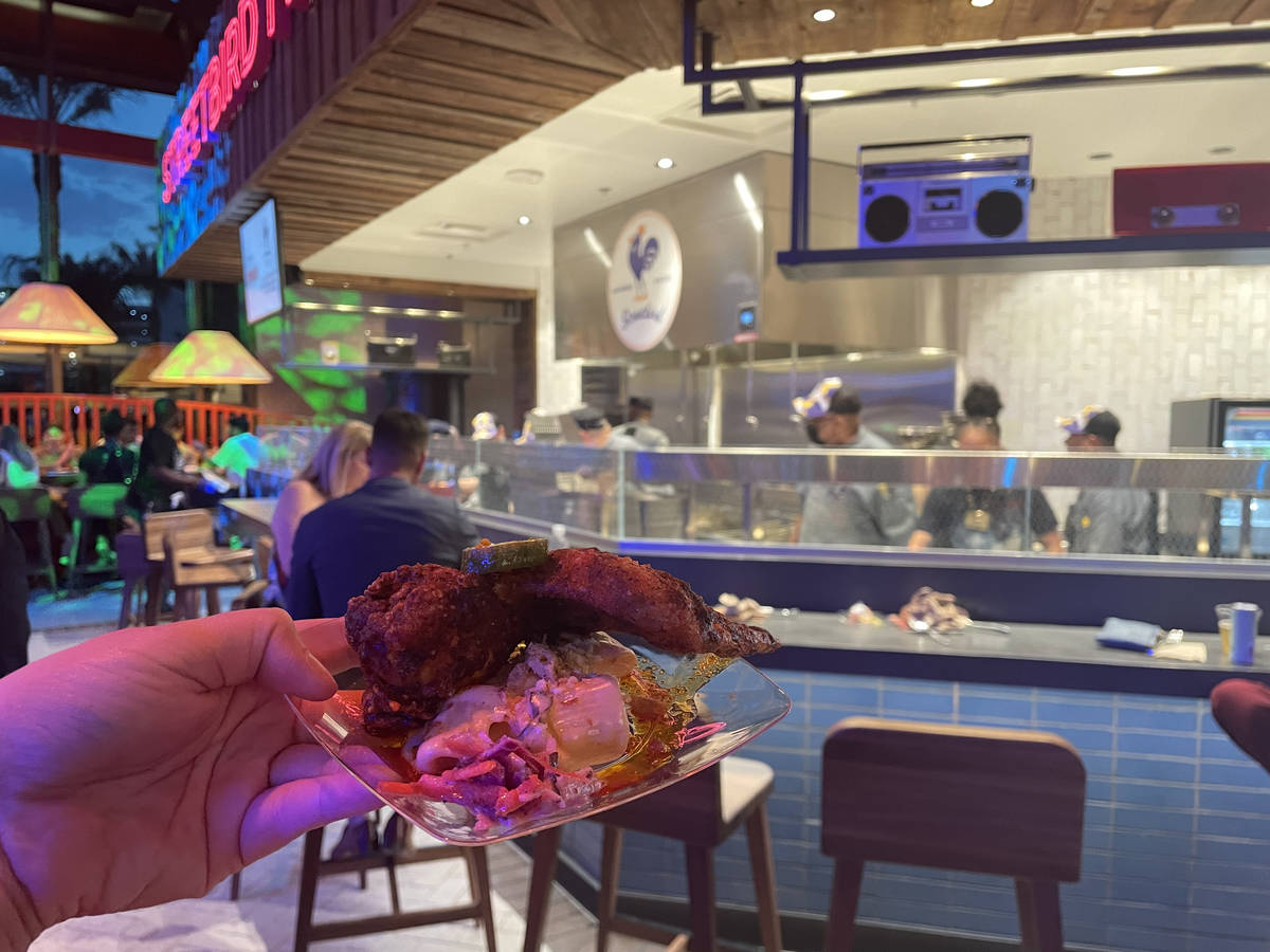 Chicken with cheesy macaroni and chicken cracklings from Streetbird at Resorts World on Thursday, June 24, 2021. (Janna Karel/Las Vegas Review-Journal)
