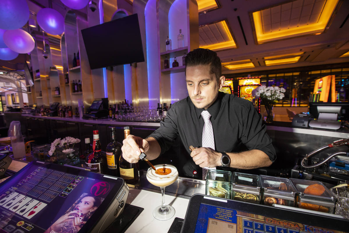 Lead bartender Michael Giambrone prepares the Old Sport cocktail at Gatsby’s cocktail lounge during a tour of Resorts World ahead of its opening in Las Vegas on Wednesday, June 23, 2021. (Chase Stevens/Las Vegas Review-Journal) @csstevensphoto