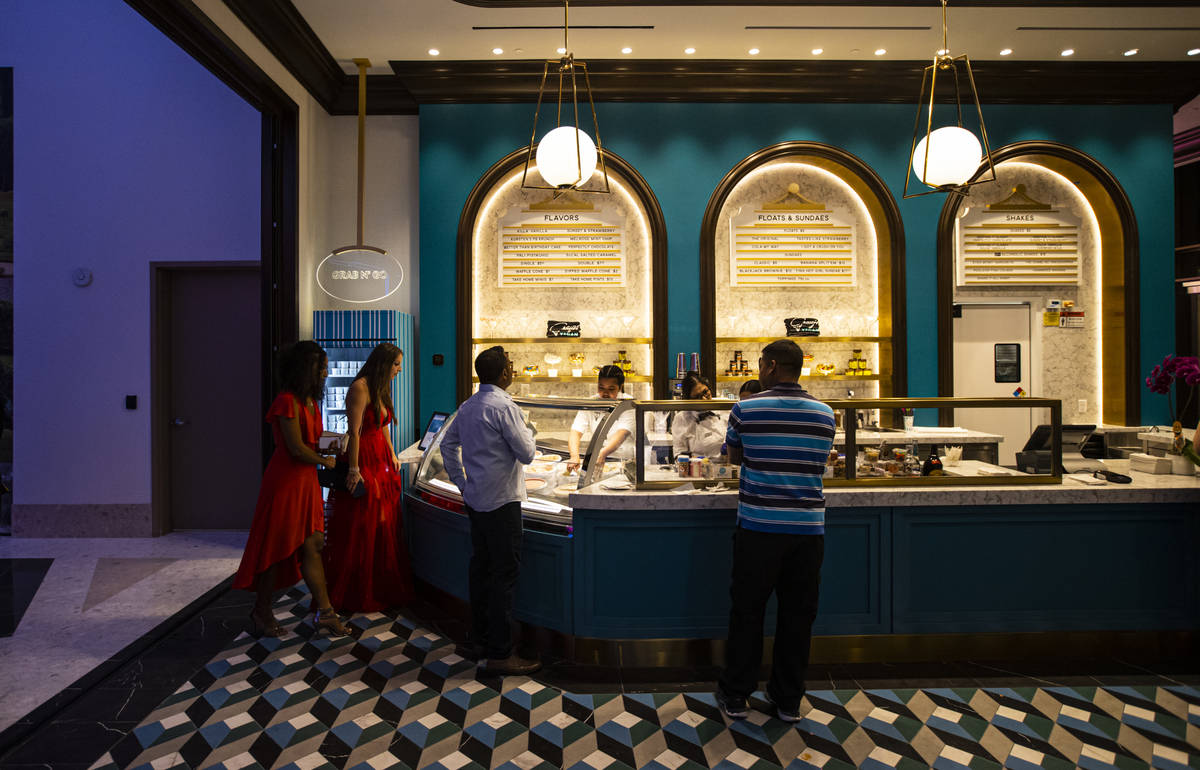 People check out offerings from Craig’s Vegan ice cream at The District during the opening night of Resorts World Las Vegas on Thursday, June 24, 2021. (Chase Stevens/Las Vegas Review-Journal) @csstevensphoto