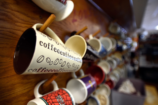 Coffee cups: Customers bring in their own coffee mugs and hang them on pegs built into the wall.