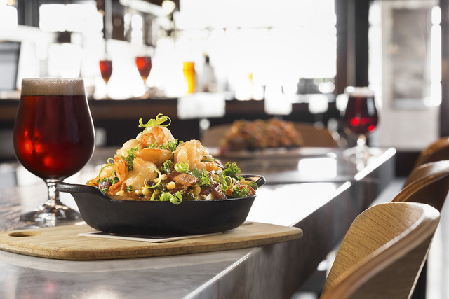 Starters, soups and salads: Crispy Buffalo cauliflower, $6; speck and eggs, $6; chorizo mac and cheese, $9; fiery calamari, $9; crock of soup, $5; kale Caesar, $9; farro and Brussels sprouts with pan-seared scallops, $16; grilled steak salad with white truffle vinaigrette, $16.