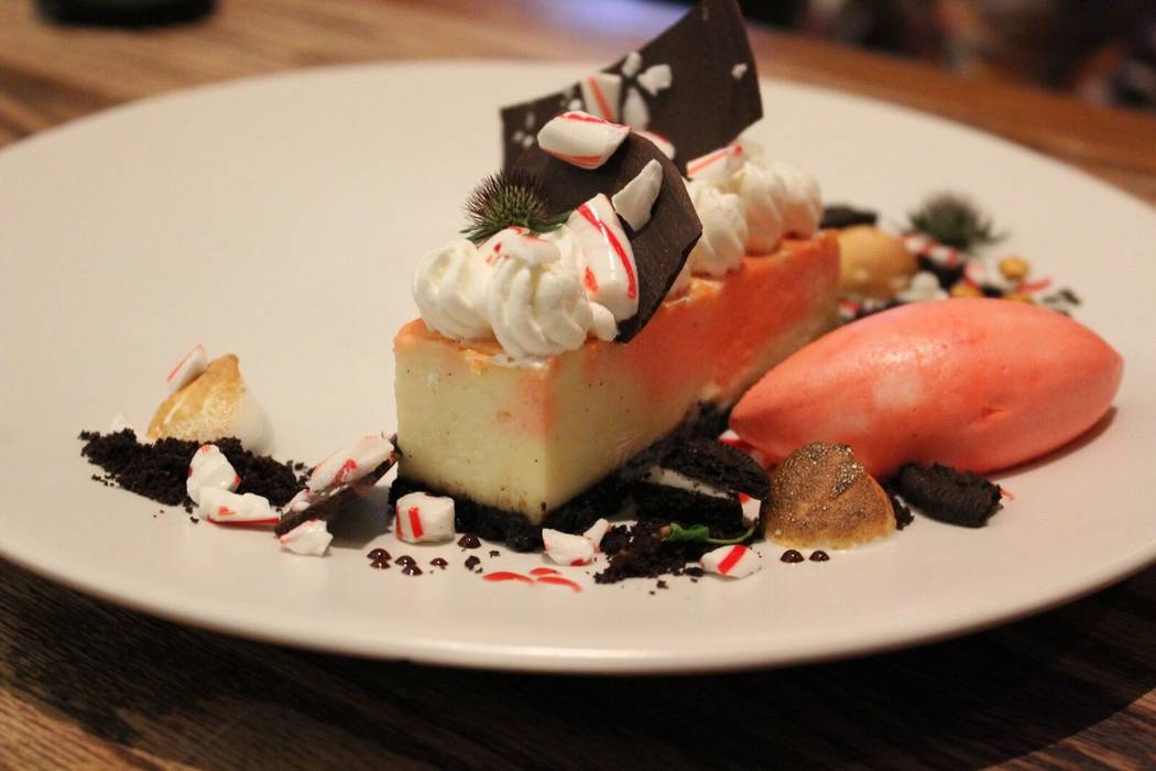 A familiar holiday flavor turns into a cool, creamy Christmas treat in this peppermint cheesecake with crushed candy cane, pretzel bark and an Oreo cookie crust, through Jan. 31, $16.