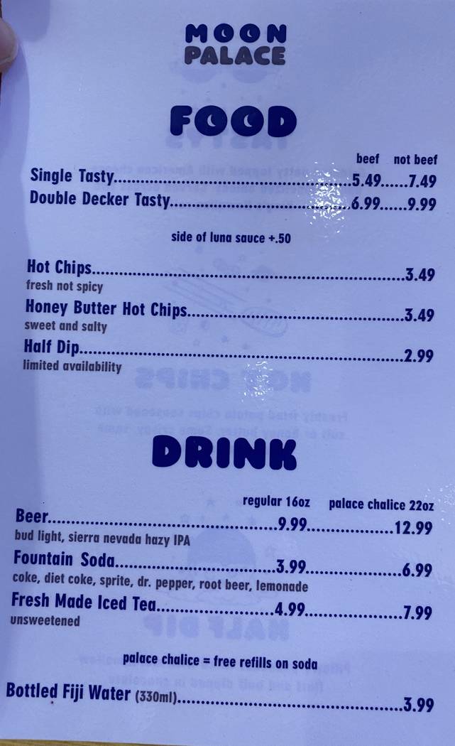The primary item on the Moon Palace menu is known as a Tasty: a griddled patty topped with cheese and caramelized onions served on a pair of King’s Hawaiian rolls. They’re offered in single or double-decker sizes of either beef or “not beef” varieties, with Impossible Burger serving as the base of the “not beef” version. Guests can accompany them with an order of hot potato chips, either plain or in a sweet and salty honey butter flavor. The sole dessert option, the Half Dip, features marshmallow fluff sandwiched between a pair of pancakes, half-dipped in chocolate. For beverages, Moon Palace offers three types of beer, fountain sodas and fresh made iced tea.