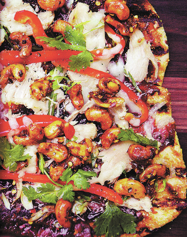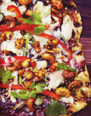 Spread the entire surface with the hoisin and sprinkle with the red pepper. Top with the chicken, scallions and pepper strips. Sprinkle with the cheese.