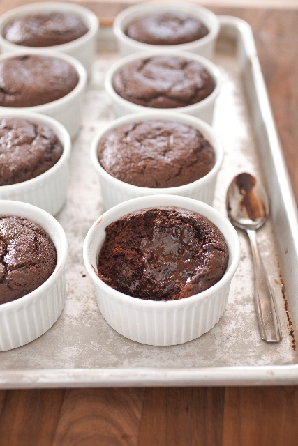 Adjust oven rack to middle position and heat oven to 350 degrees. Grease and flour eight 6-ounce ramekins and arrange on rimmed baking sheet. Whisk flour, cocoa, baking powder, baking soda and salt together in bowl. In large bowl, whisk milk, sugar, oil, eggs and vanilla together. Slowly whisk flour mixture into milk mixture.