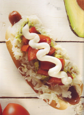 Place the hot dog in the bun and top with a handful of sauerkraut, a pile of mashed avocado, a spoonful or two of chopped tomatoes and a lot of mayonnaise.