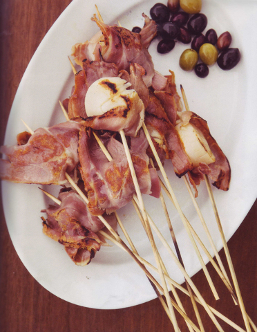 As long as three hours ahead, prep the lollipops: Lay out a sheet of presunto or prosciutto. Set a single scallop at one end on edge and roll it up like a wheel. Fasten through with a skewer, lollipop-wise. Continue with the rest and stack them carefully in an airtight tub. Keep chilled until cooking time.