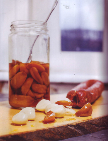 Place the garlic cloves in a jar or container that just holds them and cover with water. Retain the garlic in the jar and pour the water into a measuring cup. Note the amount. Discard half of the water and add an equal amount of vinegar. Set aside.