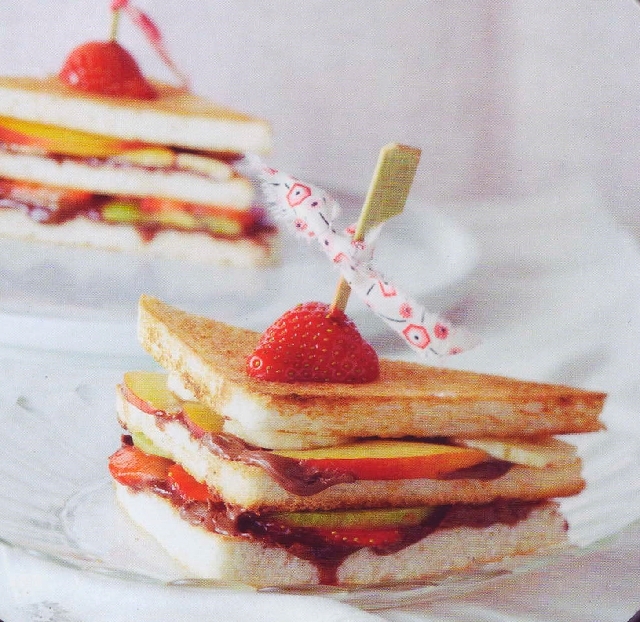 Cover each of the four Nutella toasts with another piece of toast. Spread these with more Nutella and divide the remaining fruit among them, again overlapping the pieces of sliced fruit. Finish by covering each with another slice of toast. Cut each sandwich into two triangles. Secure with a cocktail pick/toothpick and serve immediately.