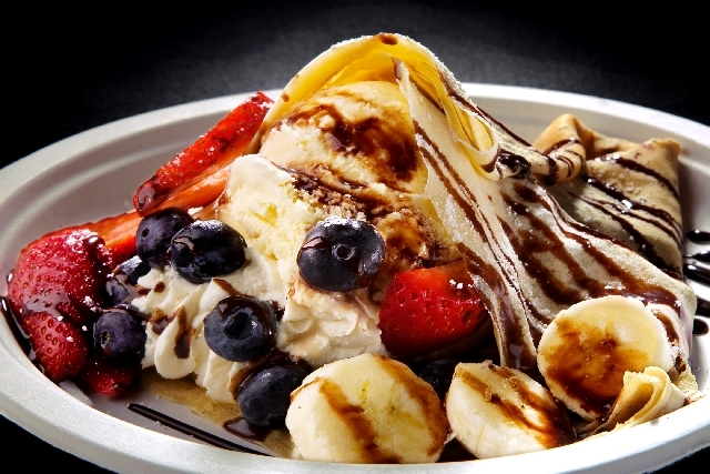Fruit crepes: strawberry, mixed berry, banana, blueberry, kiwi, mango and pineapple (choose as many as three) with chocolate, Nutella, peanut butter, caramel or strawberry sauce (choose one), $6.25, or $7.25 with ice cream