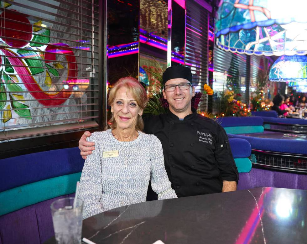 Connie Mejia, left, and Jerry Marquez, of Laughlin, sit down for their first visit ro Peppermill on Tuesday, Dec. 13, 2022, in Las Vegas. The famed restaurant celebrates its 50th anniversary on Dec. 26. (Chase Stevens/Las Vegas Review-Journal) @csstevensphoto
