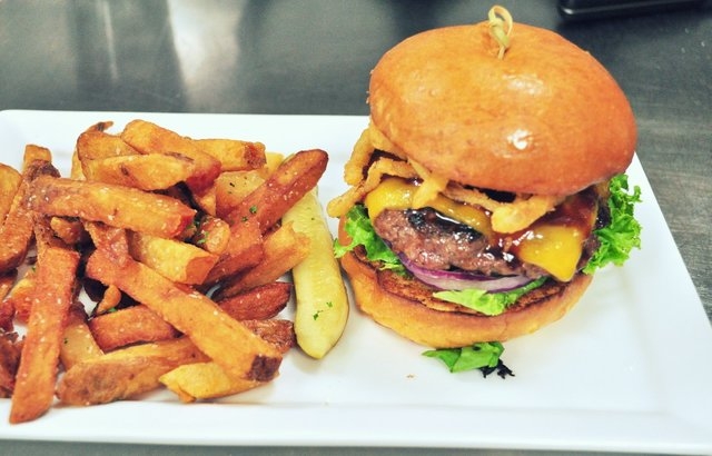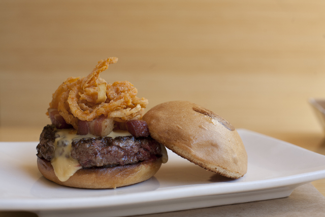 This burger earns its name with beer cheddar, bacon lardons, smoked-salt onion strings, Umami house ketchup and mustard spread, $12.