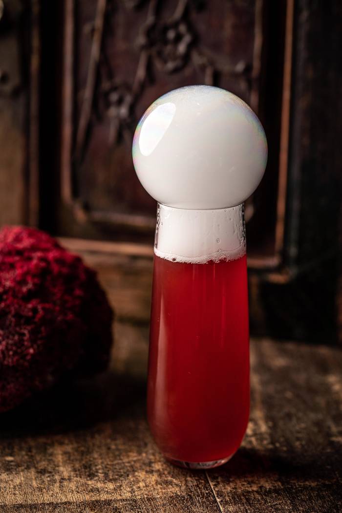 Scarlet Heaven, $18, a new cocktail at Mott 32 at The Venetian, has a citrus cloud encased in a bubble that rests atop the drink, the cloud dispersing when the bubble is burst.