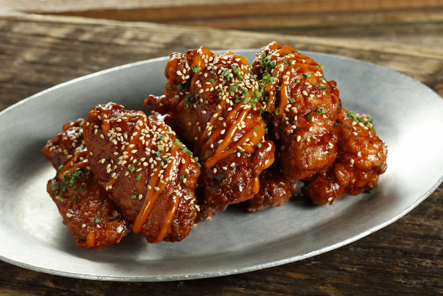 Appetizers: Crispy-style chicken wings, $15; beer-battered fish and chips, $17; shrimp and avocado cocktail, $14; Asian chicken salad, $13.