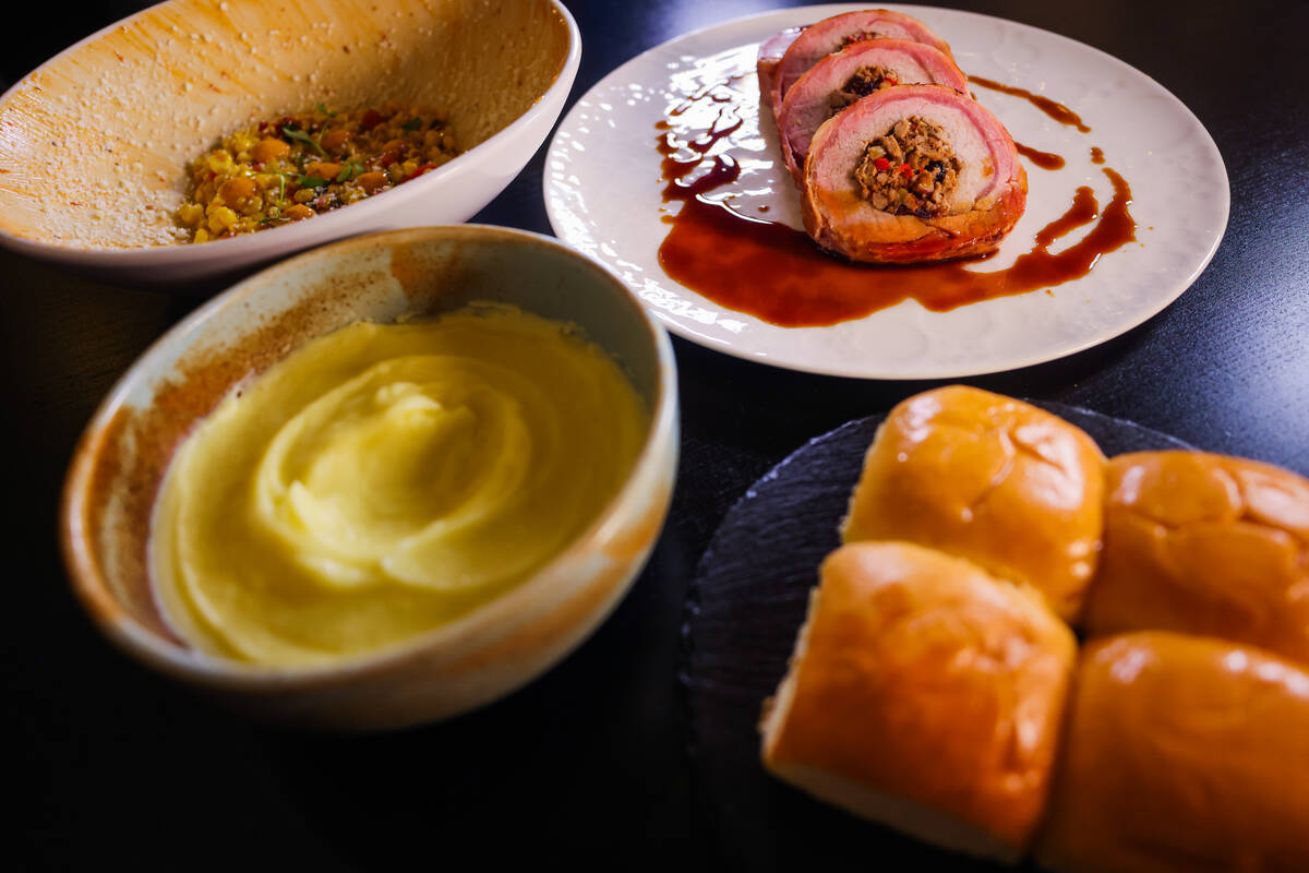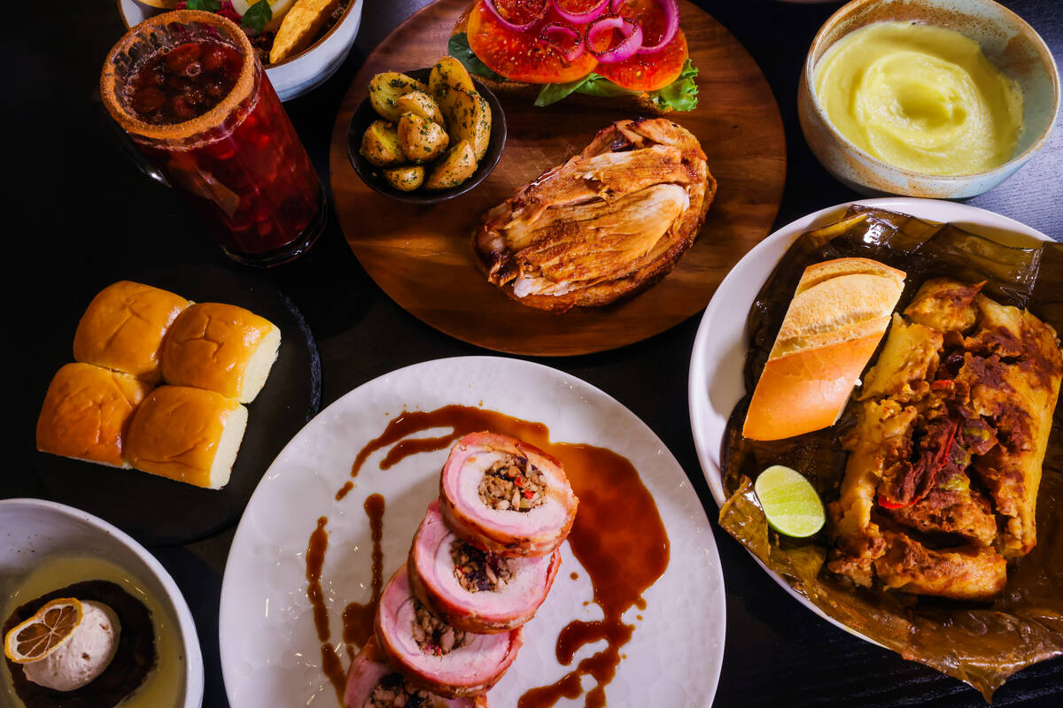 Roasted kurobuta pork leg, a brioche bun, house dressing and fries come together for pan con pierna sandwich ($20). Stuffed lomo Ibérico pork loin ($58) arrives for two. Molletes, bread pudding-stuffed rolls ($12), come with cinnamon mousse and crème Anglaise.