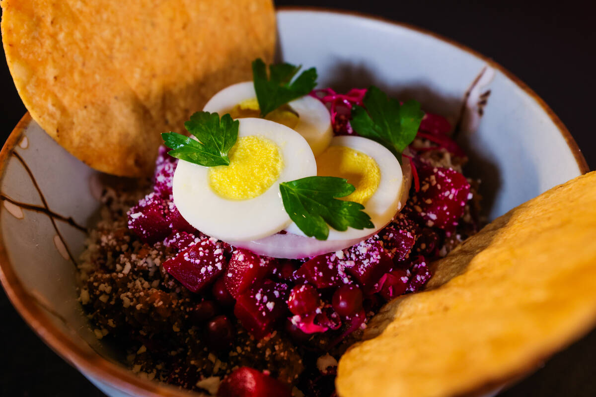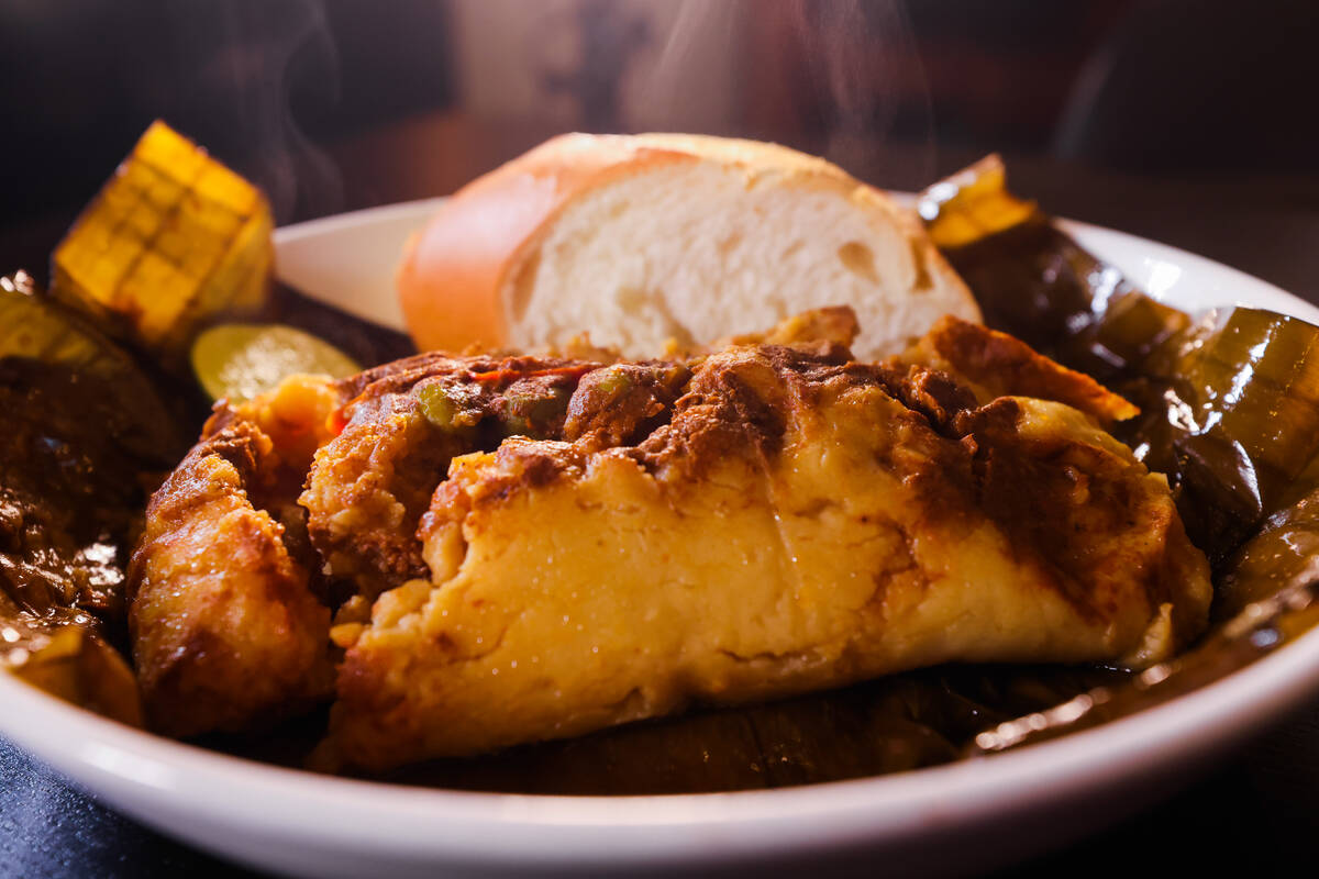 Guatemalan enchiladas ($16) feature a tostada topped with picadillo (a simmer of wagyu and minced vegetables), curtido rojo (red pickled vegetables), hard-boiled egg and cotija. Guatemalan Christmas tamales ($21) feature chicken or pork stuffing, achiote and olives.