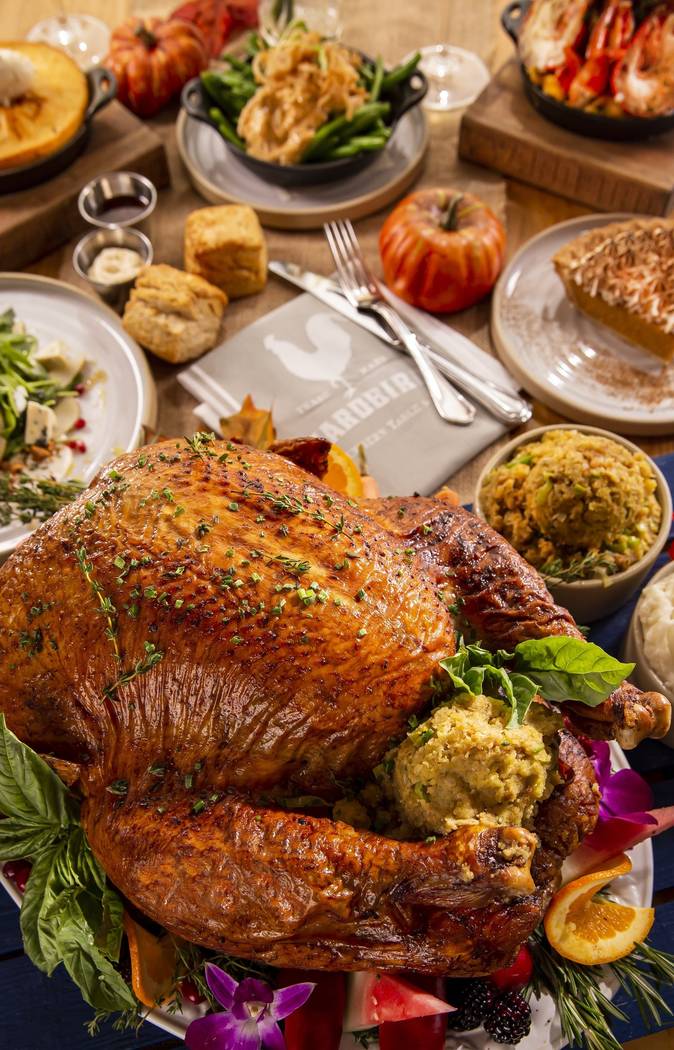 Yardbird Southern Table & Bar, The Venetian; 702-297-6541, venetian.com: Pear, pomegranate and aarugula salad, $16. Charleston She Crab Soup with pimento cheese straws, $16. Herb-roasted turkey with Mama’s Mash, green bean casserole, cranberry compote and giblet gravy, $36. Lobster mac and cheese, market price. Melted leek poato gratin, $24. Crispy Brussels sprouts, $10. Mama’s Biscuit Stuffing, $10. Green bean casserole, $10. Pecan pie with bourbon ice cream, $10. Spiced pumpkin pie with toasted meringue and peanut brittie, $10. Seasonal cobbler with vanilla ice cream, Florentine cookie bowl and cinnamon twist, $25.