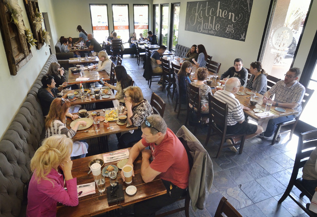 Kitchen Table is one of those places that has managed to make the most of what it has. Inside it’s tiny, with maybe a dozen tables or so, and the outdoor dining area is about the same size. But the space, effectively walled off from the residential traffic passing by on Horizon Ridge Parkway and Valle Verde Drive in Henderson, has been furnished with comfortable outdoor tables and chairs and colorful cabanas and patio umbrellas — all of which carry a very slightly funky air — with stout, massive palm trees towering above.