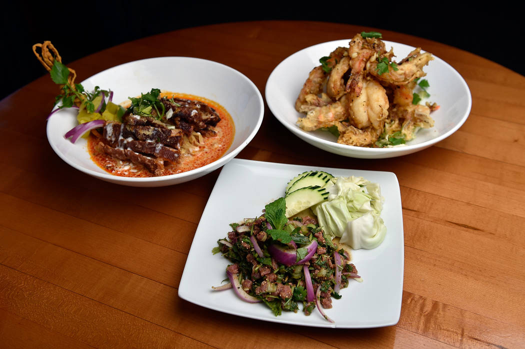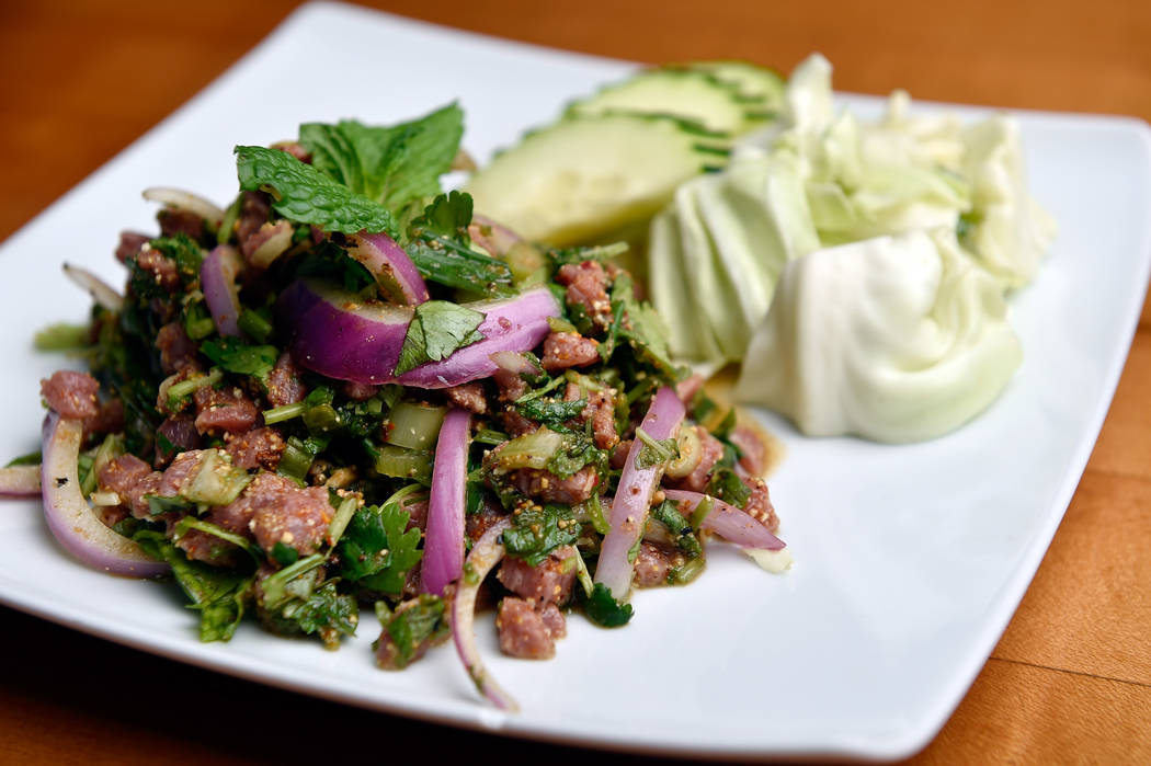 Food lovers already wearying of our warmer weather will find refreshing coolness in the Koi Soi ($18.95). Beef in this dish is similar to tartare but in the style of the Issan region of Thailand, heritage of many of Lotus of Siam’s flavors. The meat was seasoned heavily with chili, lime juice and herbs including cilantro and tossed with lots of sliced red onion. Cabbage leaves, herbs and artfully cut cucumbers on the side provided an opportunity for wrapping, cup-style.