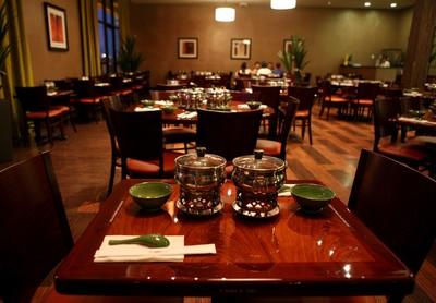 Here’s how dinner at Nina works: Upon entering, you’re seated at a table set with one chrome pot for every person. You’re given a choice of broths — chicken, beef or a spicy Thai tom yum. The broth is brought to the table in an insulated pitcher; your pot is filled and the gel fuel beneath it is lighted. Then it’s off to the buffet for the foods you’ll cook in your pot.
