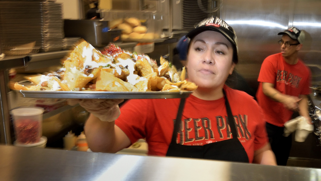 The atmosphere? Loud. Beer Park is atop Hexx on the front of Paris Las Vegas, accessed by stairs from the Strip or by elevator through Hexx, and has counter seating along (and high above) the Strip, but that’s not where the noise comes from — at least until the Bellagio fountains across the street start their spouting with a roar. No, the noise is from the competing mixed-rock music and monumental displays of sports TV.