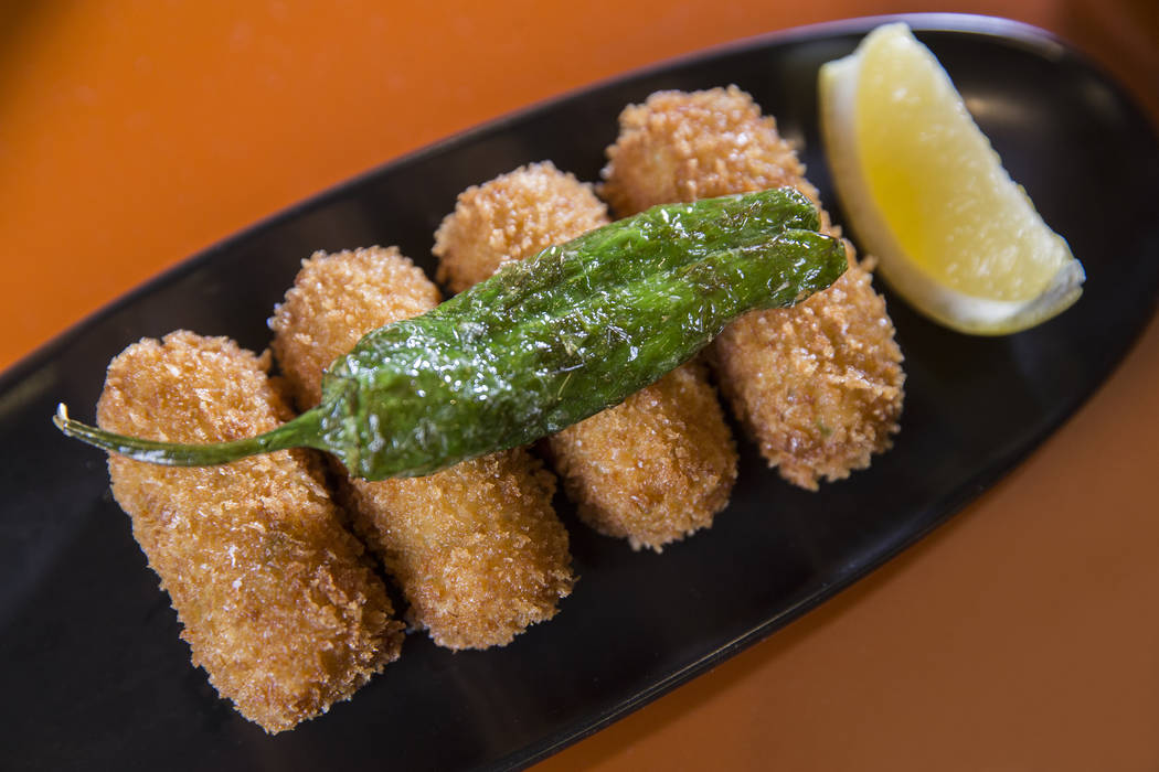 Crab croquettes ($9) also played up the contrasts, the crisp coating yielding to a creamy treatment of the sweet crustacean, flavored with Old Bay Seasoning. A blistered shishito pepper draped over the four croquettes brought it all back to earth.