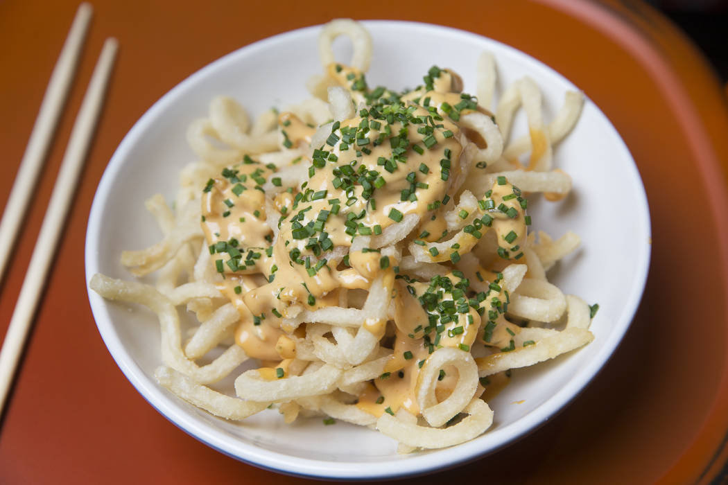 One example is Udon Fries ($5) Animal Style. Thick Japanese udon noodles were fried and, when hot, end up puffy and crispy, with a pleasingly chewy interior. The “animal-style” designation is a wink at the same-name fries on the “not-so-secret”menu at In-N-Out, which have become a cult favorite. At In-N-Out they’re topped with grilled onions, melted cheese and the company’s Thousand Island-esque “spread;” Paid in Full’s udon would be weighed down with all that but get flavor and textural contrasts from the latter.