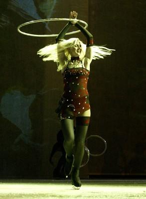 Ryshkoff’s central idea is unchanged: Most of what you see in a normal circus is done here as well, from juggling to one person’s handstand upon another, except that everything is done on skates. Brown’s work is changing the context that frames them, with hallmark transitions that should be familiar to Cirque fans.