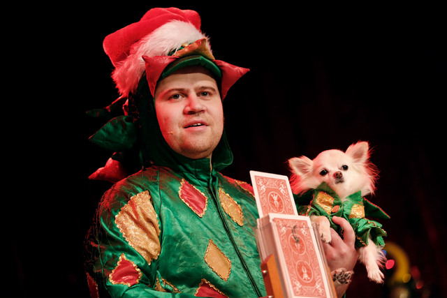 While Piff delivers on his quip that he is “contractually obligated to make it snow in Las Vegas,” Holmes is not. You could say the veteran showman accessorized his Palazzo showcase rather than giving it a full makeover: No costumes or fake snow, but a few red or green ties amid the six-piece band and a half-dozen Christmas songs in the mix on Sunday, Monday and Dec. 25 and 26.