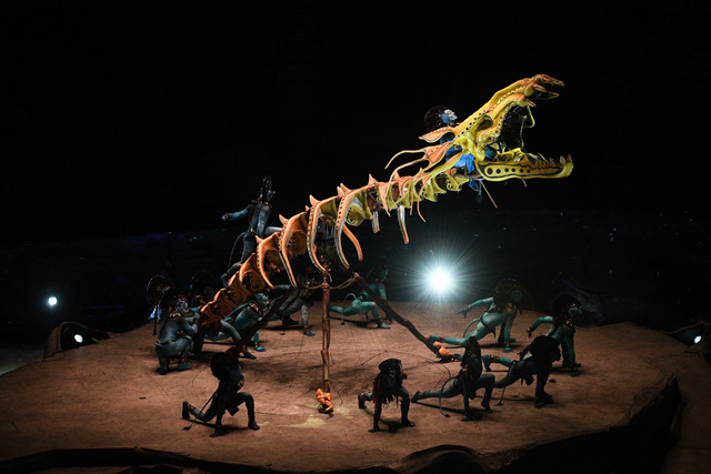 The first of its two acts takes its time in setting our young Na’vi heroes (Guillaume Paquin and Jeremiah Hughes) on a quest to collect talismans to help them tame the feared Toruk, a giant pterodactyl, and head off a predicted disaster. Their travels become a leisurely display of pageantry, an excuse to showcase Cirque’s familiar acrobatics.