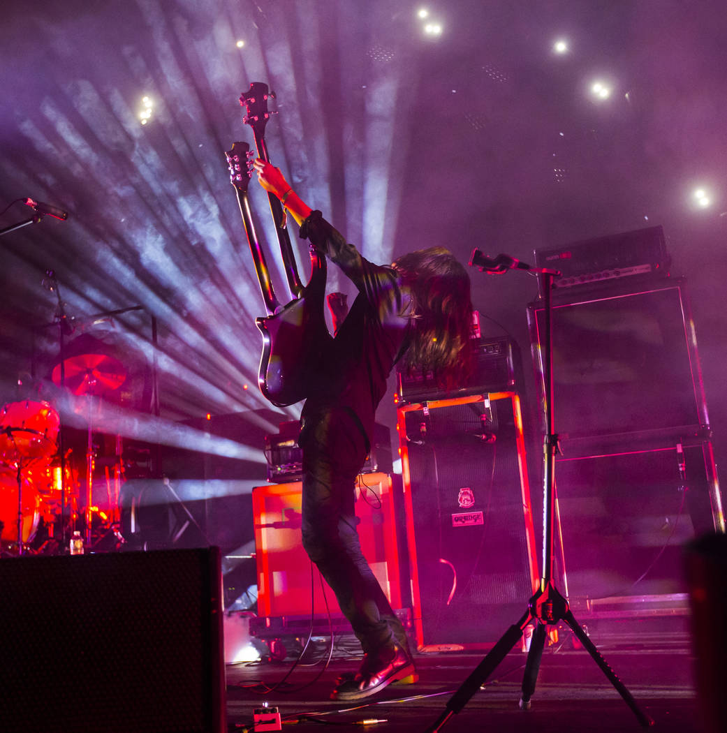 On Sunday, they twisted and shouted their way through some of the most undeniable rock anthems of the past two decades — “By the Grace of God,” “Carry Me Home,” “The Devil Stole the Beat from the Lord” — their set ending with Andersson lying flat on the stage, soloing wildly from his back, guitar still held high, of course.