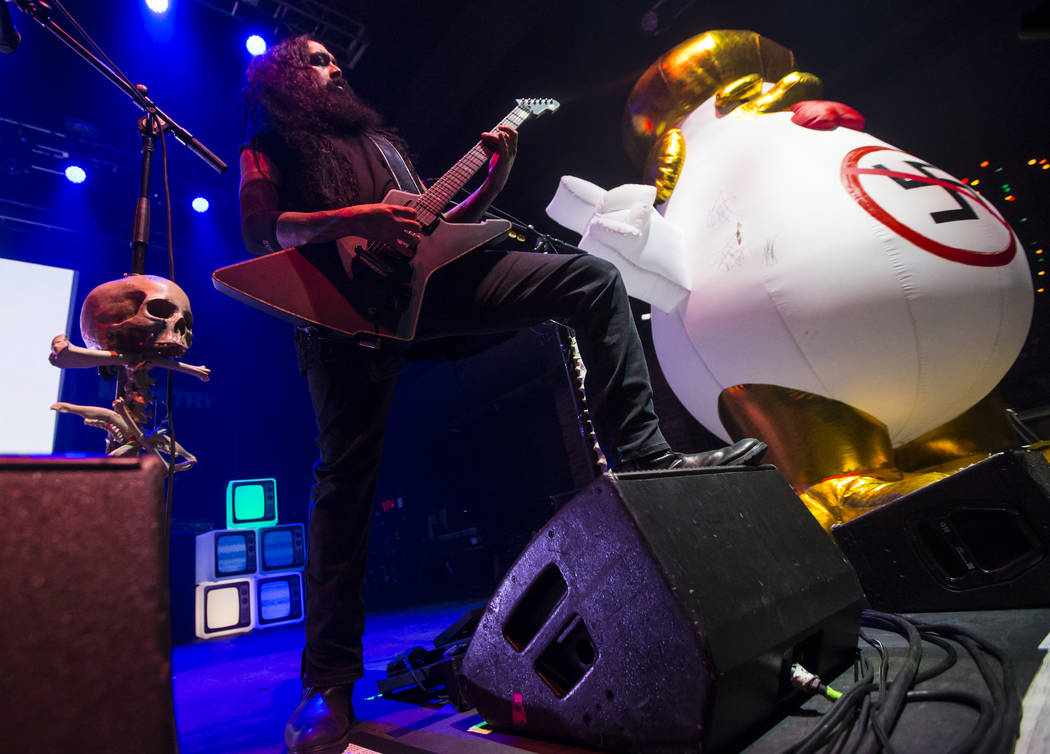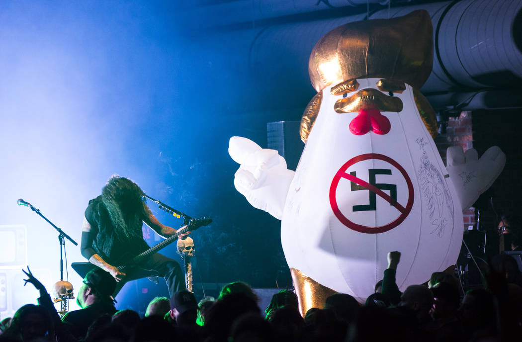 Now, it’s Donald Trump’s turn on Ministry’s new record, “AmeriKKKant,” where band members declare themselves to be “Victims of a Clown” and are touring in support of the album with giant inflatable chickens designed in the president’s likeness positioned at each side of the stage.