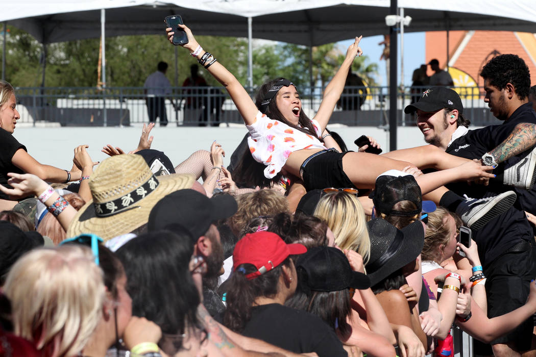 Those metalheads were everywhere, there to take in the hardcore pummel of Harms Way, whose sound was as burly as its barrel-chested singer; the Justin Timberlake-meets-Meshuggah Djent pop of Issues; the red-faced howl of Every Time I Die, whose set ended with guitarist Jordan Buckley crowd-surfing all the way back to the soundboard, dousing himself in Bud Light along the way.