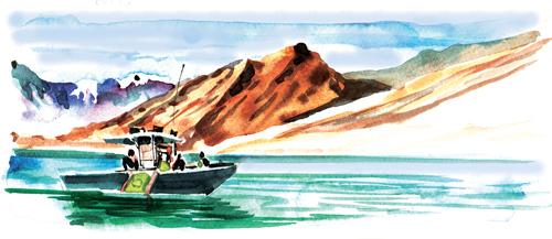 Named for mountain man Joseph Walker, who found it in 1834, Walker Lake fills a trough between mountains, measuring 12 miles long and 5 miles wide. The lake is fed only by the Walker River, which is overallocated for irrigation upstream, and its shoreline has receded about 140 feet since the late 1800s.