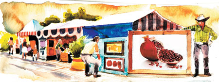 During the Pomegranate Art Festival, dozens of artists and craftsmen display art work and handmade decorative crafts in outdoor tents and indoor booths. Several booths peddle the pomegranates and the beautiful jars of jelly. Culinary arts students offer free samples of other foods using pomegranates.