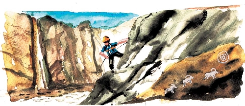 A steep-walled box canyon carved into the foothills of the Eldorado Mountains, Keyhole Canyon harbors ancient rock art and challenging rock climbing routes and is just a half-hour drive from Las Vegas. Lighter in color and shinier than other kinds of stone in these hills, the granite cliffs defining the entrance to the slot canyon are visible from U.S. Highway 95, the route south from Railroad Pass toward Searchlight and Laughlin.