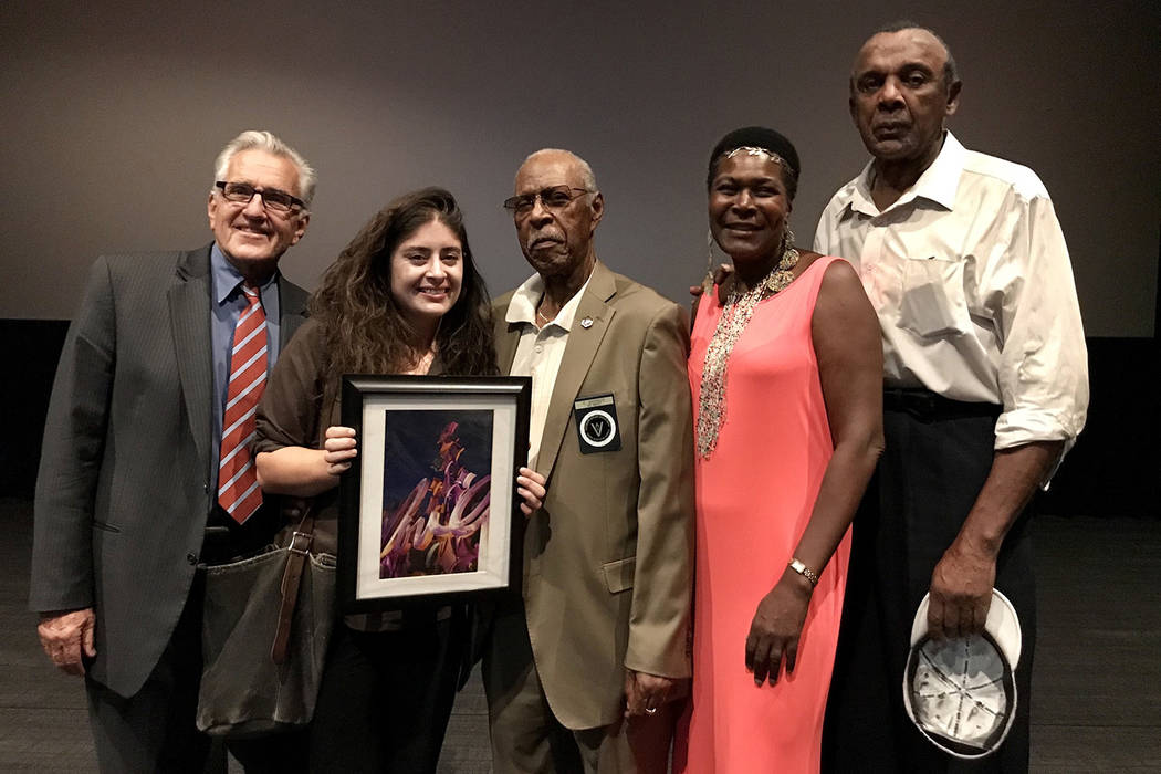 Ward 5 Chamber of Commerce President Katherine Duncan presented Aston with a framed photo of the Moulin Rouge and thanked her for a regional Emmy-winning video about the former casino, titled “The Moulin Rouge: A Fight for the Westside.” Her video, awarded the Emmy this summer, was played on a big screen Monday at Eclipse Theaters, 814 S. Third St.