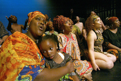 Costumed in richly patterned African fabrics, pulsating drums setting a syncopated beat, the performers run through a number as director Robert Connor, vocal director James Smith and choreographer Dawn Axam observe.