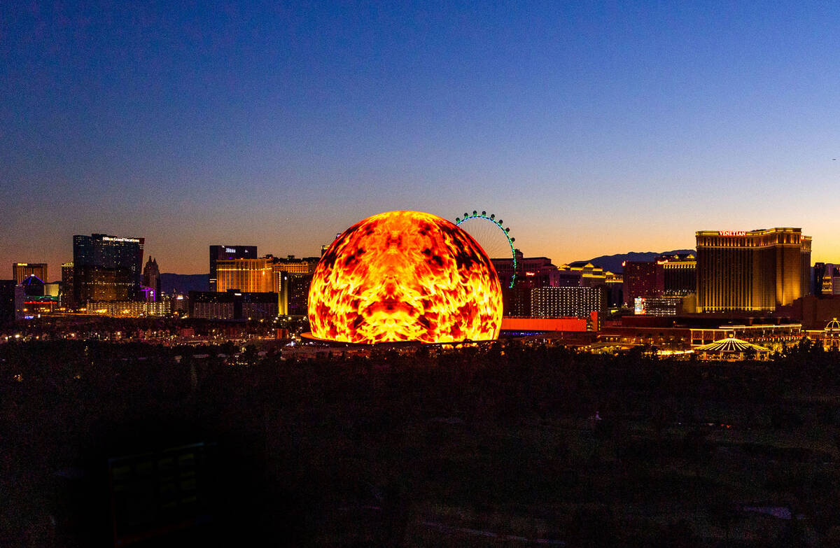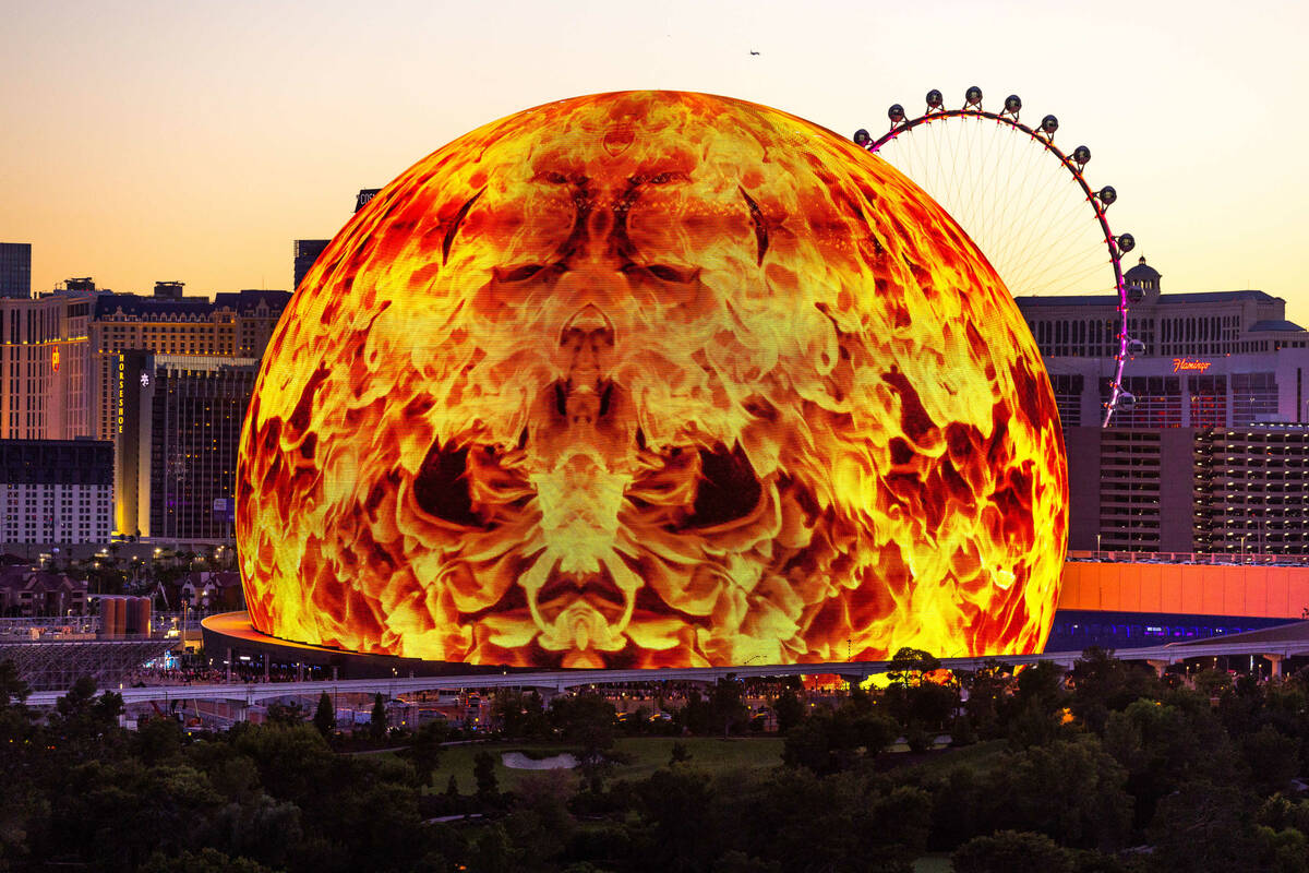 A flaming ball graphic during the opening night of the Sphere with U2 concert on stage Friday, Sept. 29, 2023, in Las Vegas. (L.E. Baskow/Las Vegas Review-Journal) @Left_Eye_Images